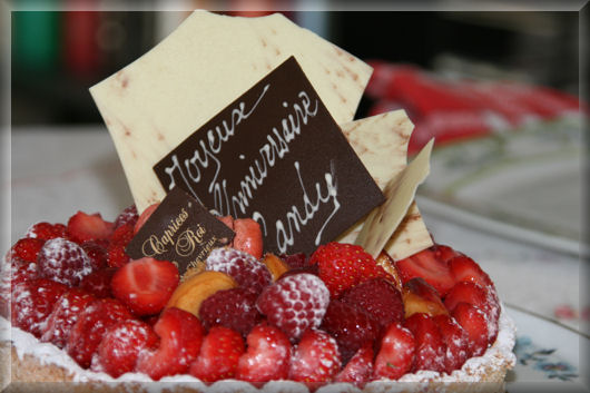 Manger le gâteau, ( Enfin, ce sont mes maîtres qui vont manger le chocolat. Moi, j'aurai de la macaronade et des framboises)